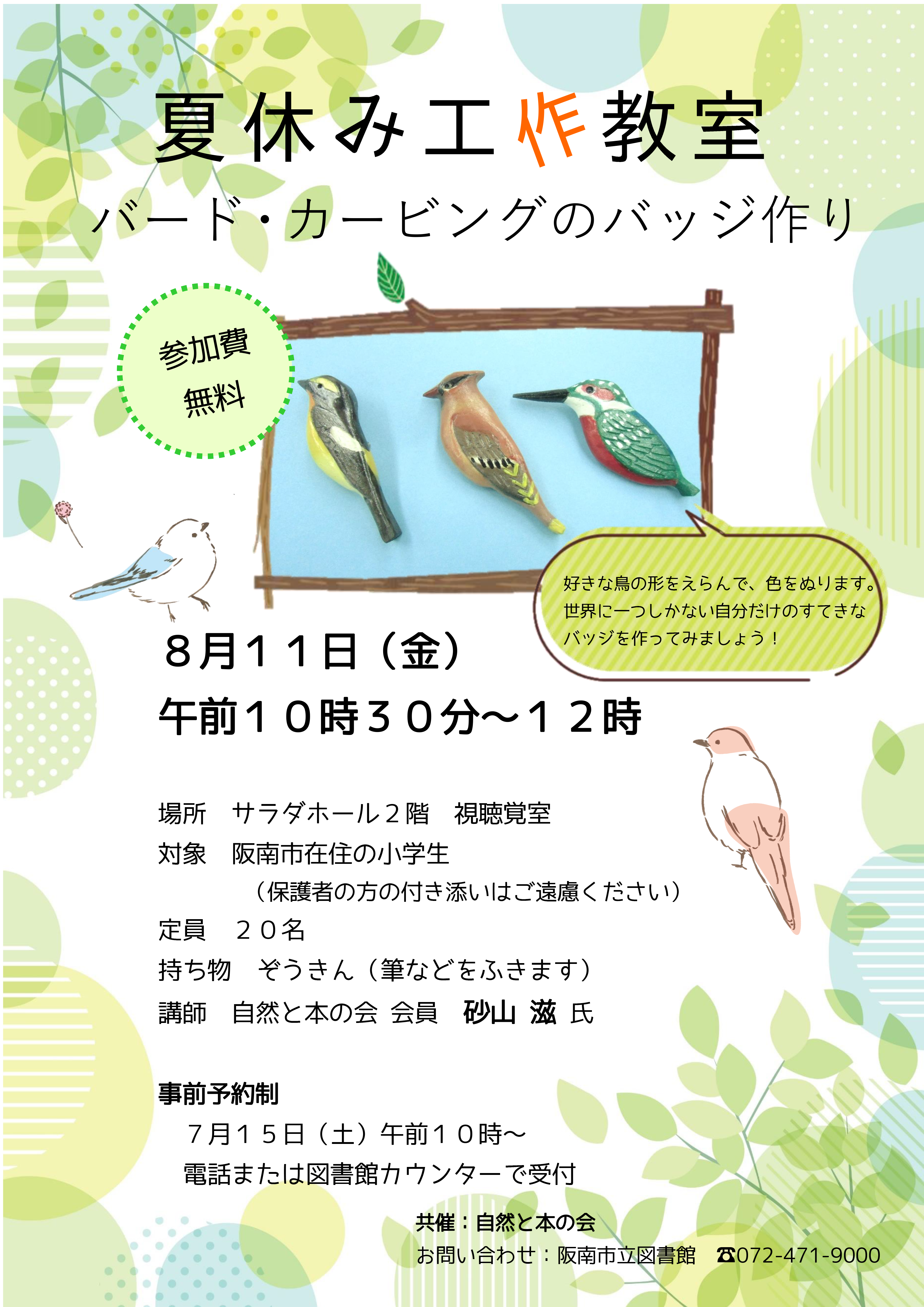 サラダホール2階 視聴覚室において、「自然と本の会」の砂山滋氏を講師に迎え、バード・カービングのバッジ作りをします♪