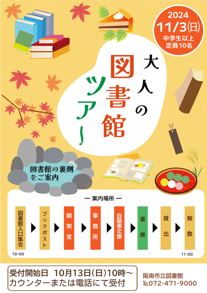 申込は10月13日(日)10:00~、図書館カウンターまたはお電話にて受付します。