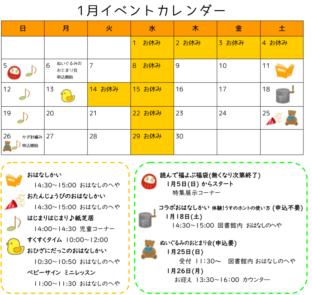 1月のイベントは以下のカレンダーの通りとなります。