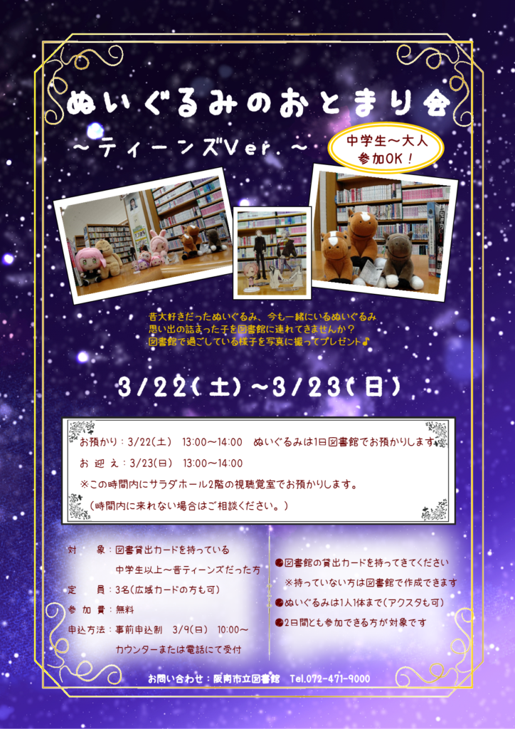2025年3月22日(土)~23日(日)まで、『ぬいぐるみのおとまり会~ティーンズVer.』を開催します!