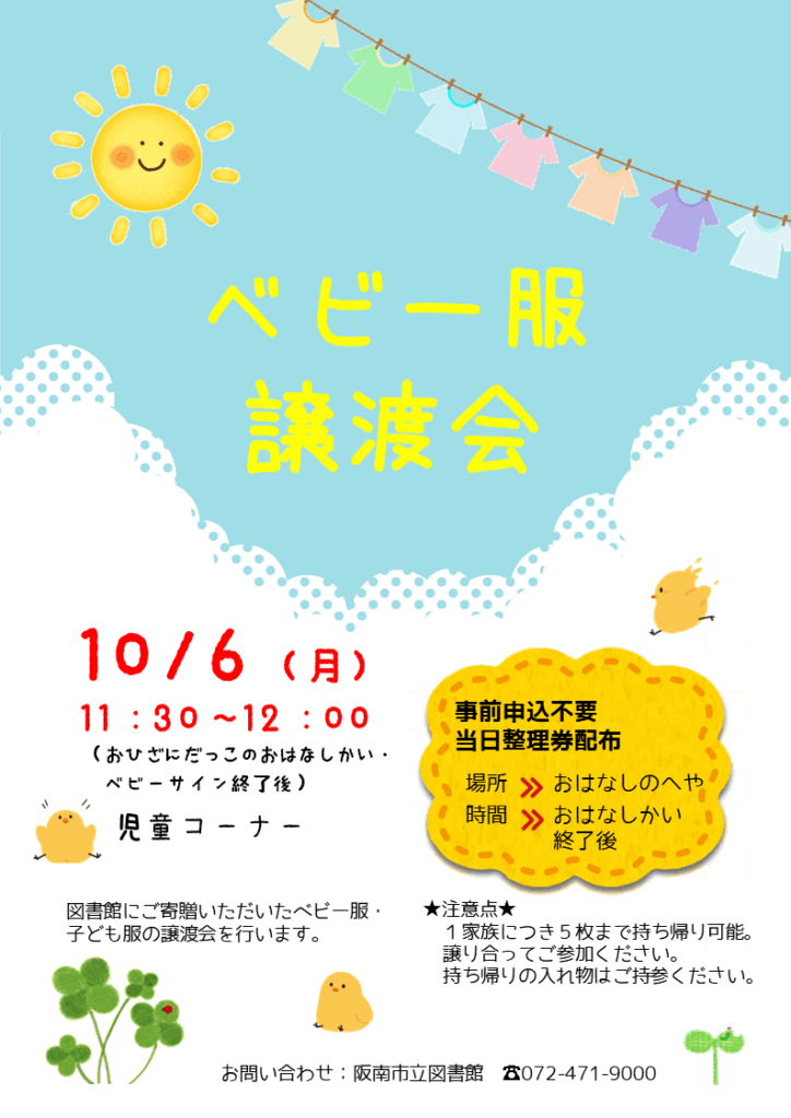 図書館に寄贈していただいたベビー服・子ども服の譲渡会を行います!