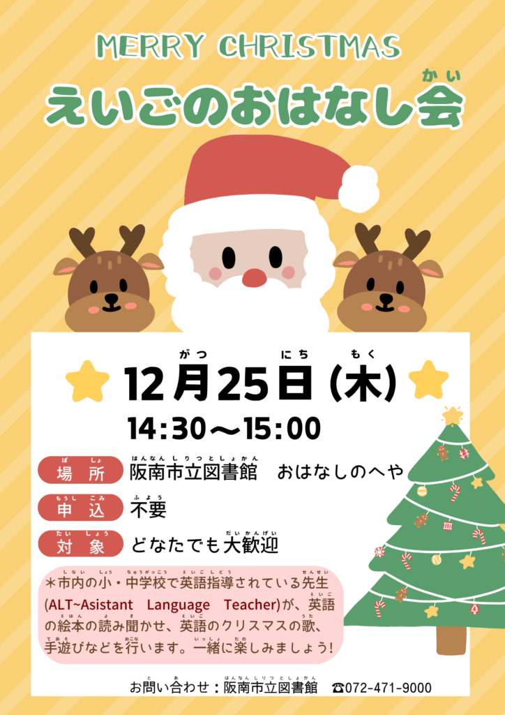 英語の絵本の読み聞かせ、英語のクリスマスの歌、手あそびなどを行います。
